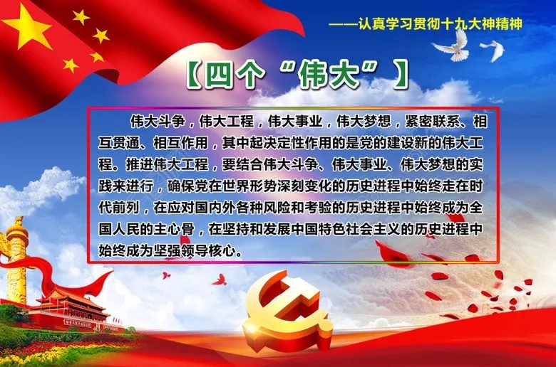 黨的十九大修改黨章明確把統(tǒng)攬“四個(gè)偉大”寫了進(jìn)來(lái),“四個(gè)偉大”指的是進(jìn)行偉大斗爭(zhēng)、建設(shè)偉大工程、推進(jìn)偉大事業(yè)、實(shí)現(xiàn)偉大夢(mèng)想。